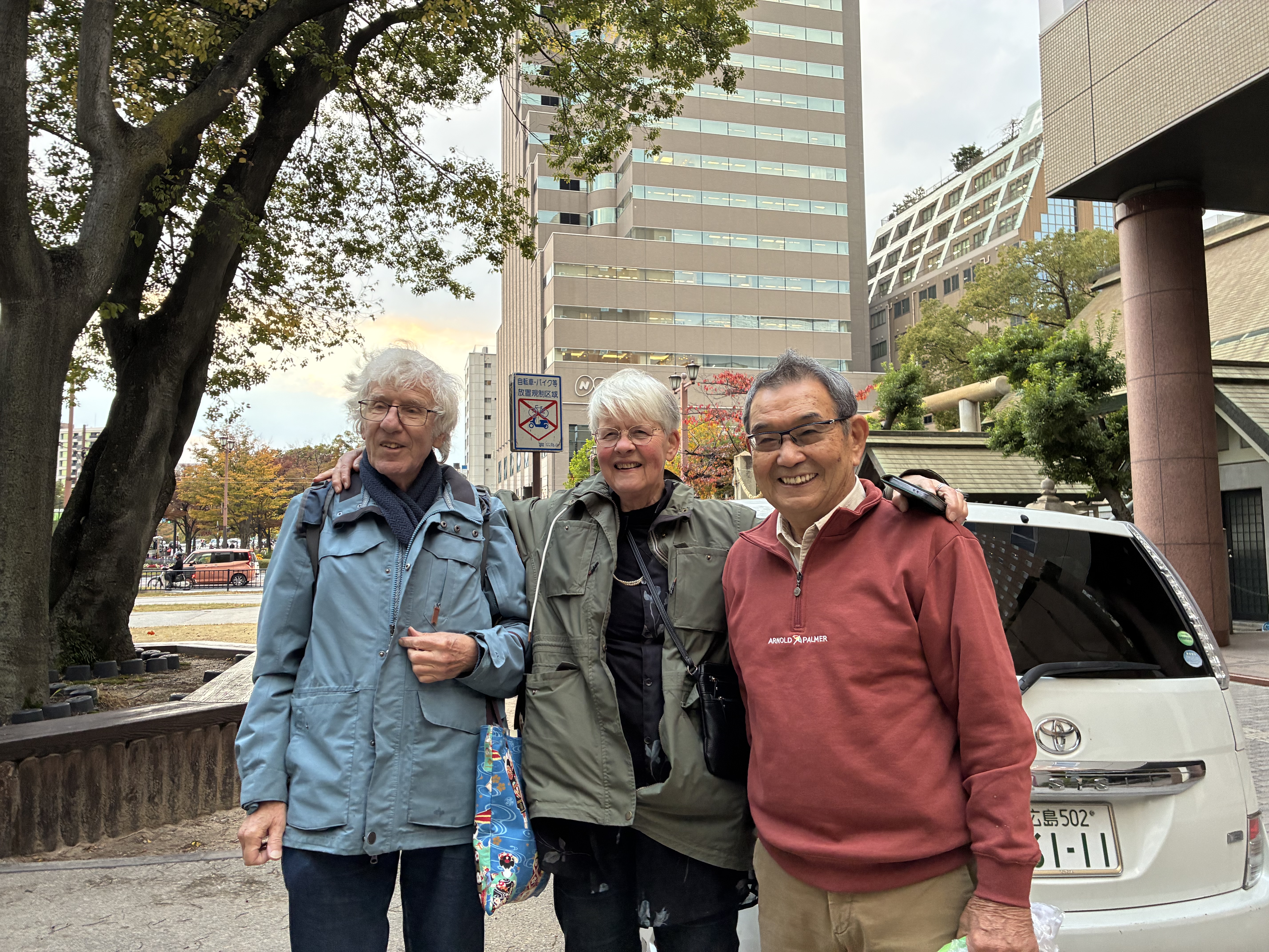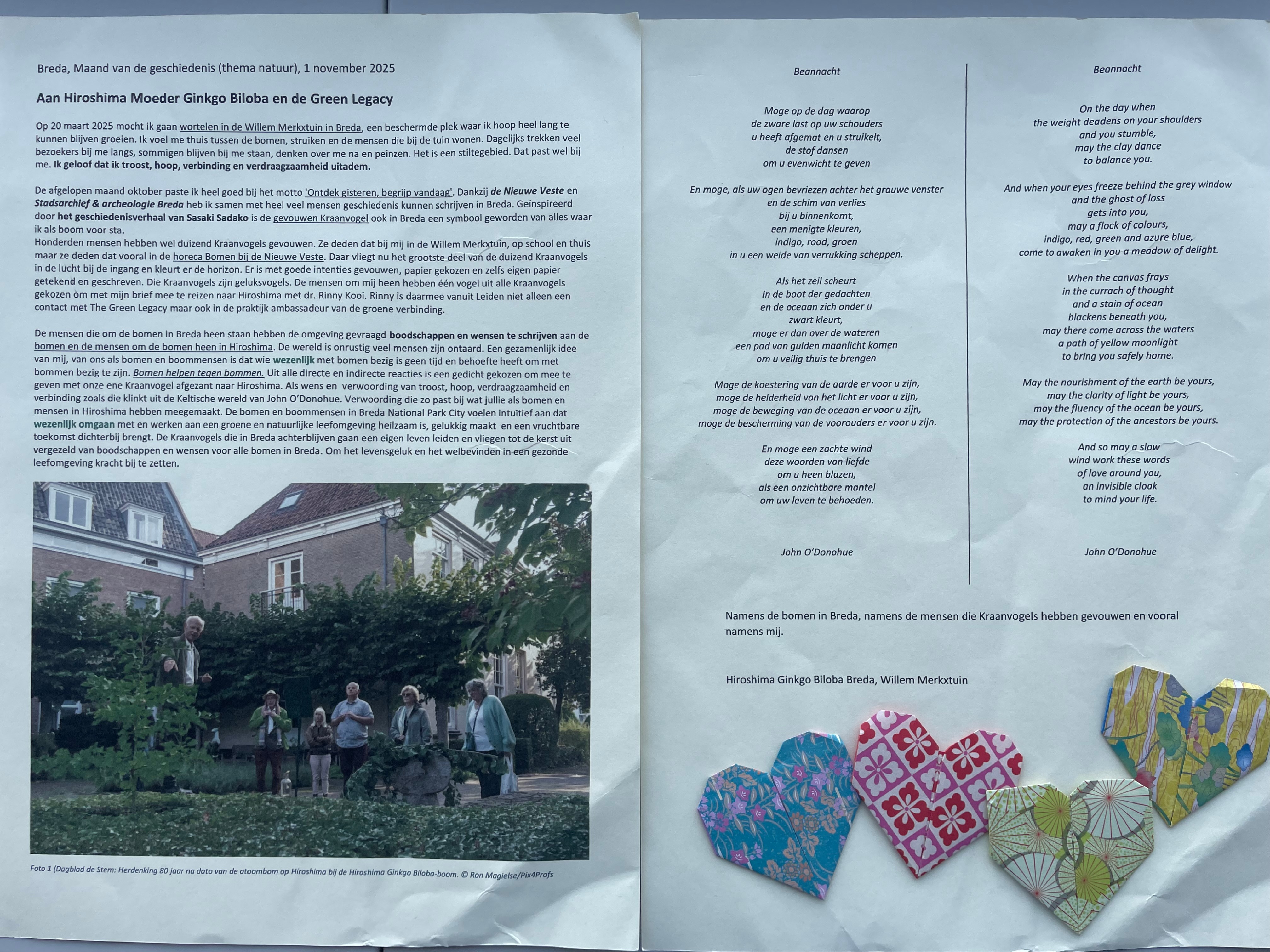 Our wonderful partner in the Netherlands, Dr. Rinny Kooi, visited Hiroshima on November 25th alongside her husband and Hiroshima peace guide/activist Keita Takagaki. They participated in our seed picking event with Hiroshima University. Rinny came bearing many gifts, including a touching message and poem from Breda, who have been one of GLH’s most engaged and active ambassadors.